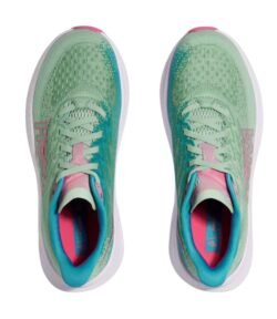 Po PROFLY™ putų sluoksniu yra stipriai išlenkta pado dalis, pagaminta iš gumuotų EVA putų, kurios užtikrina dinamišką amortizaciją ir gerą sąlytį su žeme. Hoka Mach bateliai taip pat turi gerai kvėpuojantį, žakardinį batviršį, kuris tiksliai apguabia pėdą, papildomai apsaugo Achilo sausgyslę anatomiškai profiliuotu, aukštu kulnu . Visa tai lemia, kad „Hoka Mach ” modelis sėkmingai sujungia tris svarbias savybes – lengvą bėgimą, jo dinamiką ir didelį komfortą.
