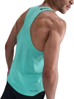 „Nike AeroSwift” marškinėliai – tai varžybų marškinėliai be rankovių, kurie užtikrins komfortą ir puikų kvėpavimą intensyviausių varžybų metu. Pavyzdinė „Dri-FIT ADV” technologija sujungia puikų, lygų audinį , itin greitai nuvedantį drėgmę, ir pažangius sprendimus, kad jaustumėtės sausai ir patogiai. Audinyje esančios skylutės sukurtos atsižvelgiant į didelio meistriškumo bėgikų ir bėgikių siūlymus, užtikrinant veiksmingą ventiliaciją ten, kur jos labiausiai reikia. Ilgesnis kirpimas padidina kūno aprėptį, o plokščios siūlės ties pažastimis ir apykakle apsaugo nuo galimo trinties.