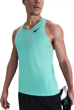 „Nike AeroSwift” marškinėliai – tai varžybų marškinėliai be rankovių, kurie užtikrins komfortą ir puikų kvėpavimą intensyviausių varžybų metu. Pavyzdinė „Dri-FIT ADV” technologija sujungia puikų, lygų audinį , itin greitai nuvedantį drėgmę, ir pažangius sprendimus, kad jaustumėtės sausai ir patogiai. Audinyje esančios skylutės sukurtos atsižvelgiant į didelio meistriškumo bėgikų ir bėgikių siūlymus, užtikrinant veiksmingą ventiliaciją ten, kur jos labiausiai reikia. Ilgesnis kirpimas padidina kūno aprėptį, o plokščios siūlės ties pažastimis ir apykakle apsaugo nuo galimo trinties.